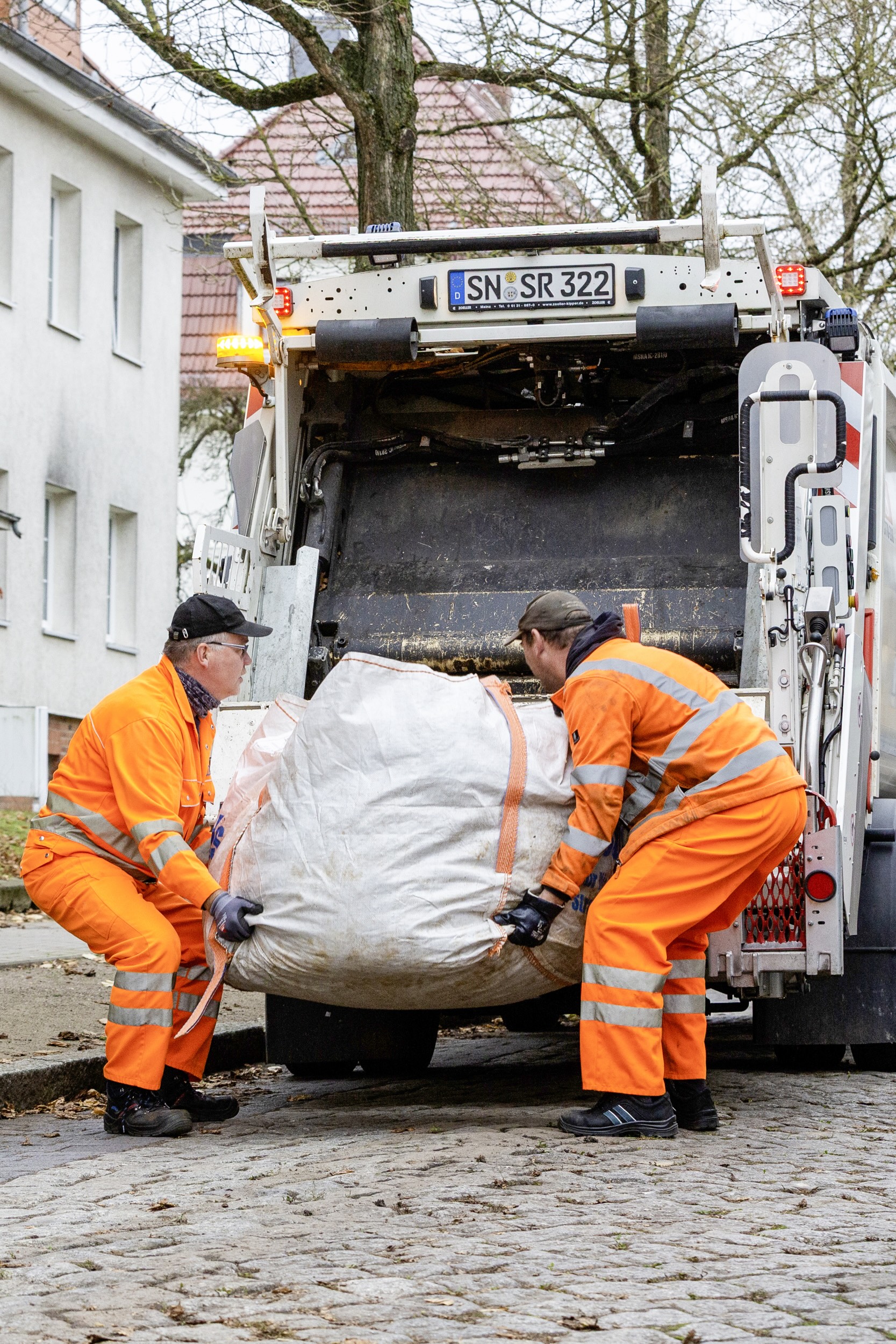 Je nach Witterung baumeln die weißen Säcke oft wochenlang schlaff an den Baumstämmen herunter – ein Anblick, der nicht unbedingt sehenswert ist. Bisher sind die Mitarbeiter der SAS mit ihrem Sammelfahrzeug durch die Straßen gefahren und haben die Laubsäcke entleert (Foto unten). Baumfrüchte, wie Eicheln und Kastanien, erhöhen das Gewicht der Big Bags zusätzlich, sodass es oft nicht möglich ist, die Behältnisse per Hand hochzuheben. „Sobald die Säcke zu schwer sind, müssen wir zusätzlich ein Kranfahrzeug losschicken. Um das Handling für alle zu erleichtern, stellen wir testweise die Rollcontainer bereit“, erklärt SAS-Betriebsleiter Markus Lange (Foto oben).